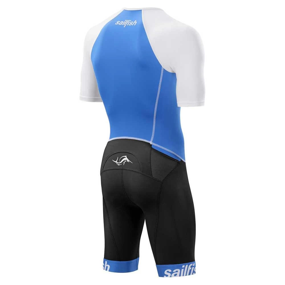 If you need maximum speed in competitions, from now on you can show yourself in the new sailfish Aerosuit Comp. The aerodynamic trisuit is forming and directional. It compresses the leg muscles, ends comfortably with the logo leg ending and convinces with high-quality, perforated seat padding made of anti-bacterial, quickly drying microfiber. The treated material on the upper body lies flat and smoothly on the skin and the sleeves offer exceptional UV-protection on hot days. The zipper in front is continuous. Furthermore the back pocket and two side mesh pockets help with safekeeping and easy access of competition provisions. With our new Aerosuit Comp youÂ’re aerodynamically one step ahead.