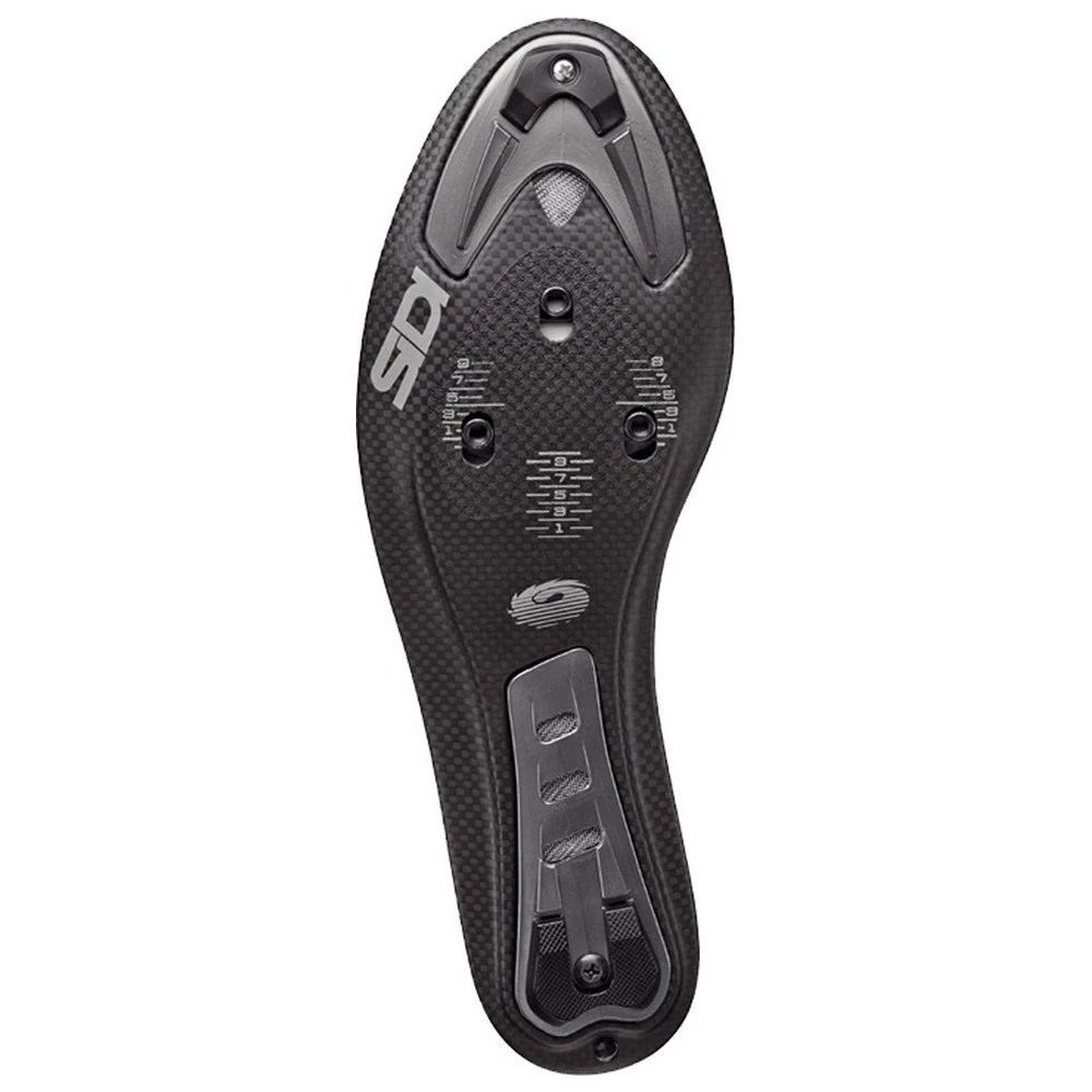 – Made of the latest generation carbon, thanks to the special conformation of the metatarsal area, it increases the transmission of power directly on the pedals, guaranteeing ideal power transfer and support. The new oval holes extend the adjustment the position of the cleat by ± 5 mm of a millimetre scale is included for remembering the riders personal cleat position